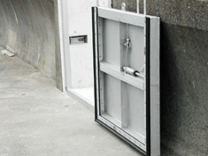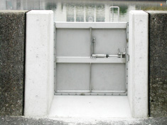 | 海岸・漁港などに設置し高潮などの水の侵入防止を目的とし、側部ヒンジを中心として回転させ閉鎖時は締付装置により固定させ水の侵入を防ぎます。 | |